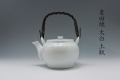 白磁製の白無地土瓶。ステンレス中アミ付き、持ち手は金属に天然かずらつるが巻いてあります。サイズ4号(12.0cm×16.0cm×10.0cm)容量約550cc、6号( 14.0cm×17.5cm×11.5cm )容量約950cc、8号(15.0cm×19.0cm×12.5cm )容量約1300cc、10号(16.0cm×21.0cm×13.0cm )容量約1800cc