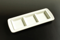 奥行11cm×幅28.6cm×高さ2.1cm、約7cm角が3つ連なったメラミン樹脂製、食器洗浄機対応の仕切りプレート。軽食のおかず3品盛やビュッフェ、バイキングの取皿に。角が丸く軽くて丈夫重なりも抜群です。