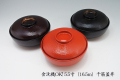 直径16.5cm×高さ9.2cm(身の高さ6.2cm)、容量750cc、食洗機OKなABS樹脂製の平型のふた付き丼。鰻丼、ローストビーフ丼などに。オレンジ、黒、溜塗の3色