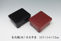 食洗機も電子レンジもOKな木目のPBT樹脂製丼重。身のサイズ15.8cm×13.4cm×高さ7.1cm(蓋をして16.7×14×高7.5cm)、光沢のある黒と赤(吟朱)の2色。内側はともに朱塗り。蓋をしてもしなくても重なります。