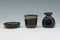 益子焼のような天目釉のそばつゆ入れと猪口、薬味小皿。そば徳利サイズ直径7.6cm×高さ8.4cm、容量約140cc、そば猪口口径8cm×高さ6.9cm、容量約150cc(すりきり)、小皿9.8cm×9.5cm×高さ2.3cm、それぞれ単品の他セットもございます。