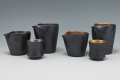 悦山窯による冷酒器とぐい呑み。外側は光沢を抑えた黒、内側は吹きつけ金彩と銀彩。サイズは小9.4cm×7.7cm×高さ7.6cm、容量約180cc、大10cm×8cm×高さ10.3cm、容量約300cc、ぐい呑み直径5.4cm×高さ5.7cm、約70cc。*食洗機、電子レンジは不可