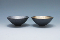 直径15.2cm×高さ6.3cm、悦山窯による多用鉢にもなるごはん茶碗。外側は絞りのような光沢のない黒、内側は抑えめな金彩と銀彩。それぞれ単品の他、ギフト用に金銀ペア茶碗箱入セット、ペア茶碗に越前塗の木製ペア箸組み合わせた箱入セットもございます。*釉薬の特性で発色に個体差がございます。
