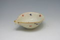 幅15cm×奥行13cm×高さ5.7cm、まるで楽器の琵琶のような形状の小鉢。透明釉に小紋が施されています。取鉢やお鍋のトンスイにもおすすめです。