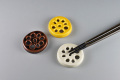 幅4.7cm×奥行4.5cm×高さ0.5cm、有田焼のレンコン箸置き。見通しがいいと縁起ものです。カラーは茶色(煮レンコン)、黄色(からしレンコン)、白(酢レンコン)の3タイプ