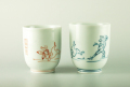 洸琳窯による鳥獣戯画をモチーフにしたゆのみ茶碗。手にすっぽり馴染むいい形状です。写真では分かりずらいですが青みがかった独特の白磁をベースに描かれています。サイズ大(青)直径7.3cm×高さ8.8cm、小(赤)直径6.8cm×高さ8.2cm。 お揃いでごはん茶碗もございます。