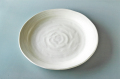 直径26.5cm×高さ3.6cm、温かみのあるクリーム色にうっすらとグレーの刷毛目がある粉引き風の丸皿。完全な円ではなく僅かに変形しています。重なりが良くとんかつ、パスタ、盛合せなどいろんな使い方ができる多用皿です。