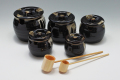 とんかつソースやお好み焼きの鰹節、漬け物や調味料などに陶器製のふた付き壷。内側は透明釉がかかっています。渕は素焼きです。ひしゃくやスプーン、刷毛が入るように本体の渕に切り込みがございます。釉薬のはね、飛び、蓋のかたつき、濃淡の個体差等多少ございます。サイズは5種類で1合(約150cc)胴周直径8.5cm×高さ7.5cm、2合(250cc)胴周直径9.8cm×高さ9cm、3合(400cc)胴周直径11cm×高さ9.8cm、4合(550cc)胴周12cm×高さ10.8cm、5合(850cc)胴周直径14cm×高さ12cm。