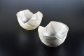 幅13cm×奥行11cm×高さ7.5cm、兵山窯による土物の小鉢。サイドを意図的切り込み面白い形に仕上がっています。パールのような銀彩の釉薬がモダンな印象を与えています。赤や緑のものが映えそうです。手造りのため釉薬濃淡個体差がございます。