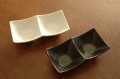 たれや薬味、お通しに2つに仕切れた角鉢。8cm角の小鉢が2個くっついたような作りで重なりも良いです。
