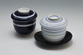 身の直径8cm×高さ7cm、蓋直径8.8cm、蓋をしたとき高さ8.8cm、容量渕下1cm約150cc、標準サイズの茶碗蒸し。派手さはありませんが生地の質、蓋のつまみやすさなど秀逸です。紺色のドット柄と白地のライン柄の2パターンございます。