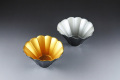 幅11.2cm×9.5cm×高さ6.3cm、つやを抑えた金彩と銀彩の珍しい楕円形の菊型小鉢。外側の光沢のある黒が引き締めています。酢の物、和え物に