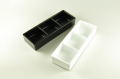 幅6.8cm×長さ19.2cm×高さ3.6cm、ABS樹脂製の中身を入れたまま積み重なる仕切り角鉢。お通しや薬味入れに。仕切りの高さは2cmです。食洗機OK。色は白か黒