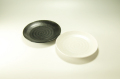 直径15cm×高さ2.2cm、メラミン製の丸皿。光沢を抑えて陶器に近い雰囲気を出しています。軽くて丈夫、重なりもよく食洗機もOKです。黒と粉引き(白)の2色。他に3サイズございます。