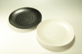 直径21cm×高さ2.6cm、メラミン製の丸皿。光沢を抑えて陶器に近い雰囲気を出しています。軽くて丈夫、重なりもよく食洗機もOKです。黒と粉引き(白)の2色。他に3サイズございます。