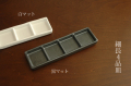 ソースやたれ、お通し,薬味など4品盛れる仕切り皿。長さ20cm×幅6cm×高さ1.8cmとコンパクトなつくり。つやを抑えた「白マット」とメタリックな「黒マット」の2色。 同シリーズ3品、5品もございます。焼き肉のたれにはやや小さいです。