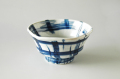 口径16.5cm×高さ8.6cm、容量約500cc(渕から2cm下)、大胆にひしゃげたフォルムにブルーの格子模様が施されたインパクトのある丼。麺類、ごはん物の丼に。サイズ大もございます。