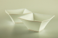 1辺13.2cm×13.2cm×高さ6.5cm、底面(盛り付け部分)約5cm角、薄手でシンプルかつダイナミックな角小鉢。和え物や煮物などに。内側は青の染付、外側は赤絵のラインが施されています。