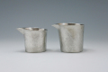 表面の鎚目、フォルムが美しい本錫製片口。液体のキレもいいです。小サイズ9.5cm×6.7cm×高さ7cm、容量約140cc、大サイズ10.2cm×7.3cm×高さ8.2cm、容量約240cc。手造りのため形状、容量は目安にして下さい。木製箱入