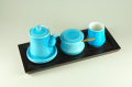 色鮮やかなトルコブルーのしょう油さし、七味やラー油などに竹製スプーン付きからし入れ、ようじ入れ、木製長角トレー。それぞれ単品からセットまでお選び下さい。釉薬の特性で表面にヒビ割れたような貫入がございます。濃淡の個体差が多少ございます。ご了承下さい。しょう油さし本体サイズ直径5.7cm×幅7.5cm×高さ8cm、受皿直径7.5cm×高さ1.4cm、容量70cc、からし入れ直径6.2cm×高さ4.5cm、竹製スプーン幅1.4cm×長さ9cm、ようじ入れ直径5cm(口径4cm)×高さ5.2cm、木製長角トレー幅10.2cm×長さ23.8cm×高さ1.5cm
