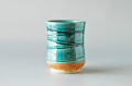 口径8cm×高さ10.5cm、容量250ccの土物の大きい湯呑。さわやかなトルコブルー釉、内側はお茶の色が分かる白マット釉です。内側は釉薬の特性で斑点がございます。寿司湯呑に