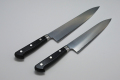 越前・高村刃物による牛刀包丁。鋼材はV10スペシャルというステンレス鋼。刃渡り18cmと21cmがございます。熟練職人による本刃付け済み。柄は積層木、がたつかない3つ鋲。す。刃渡り18cm(全長30.5cm×幅4.4cm×柄厚み1.5cm)、刃渡り21cm(全長33.8cm×幅4.5cm×柄厚み1.6cm)
